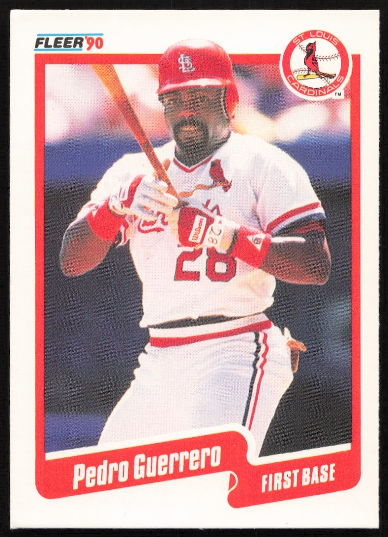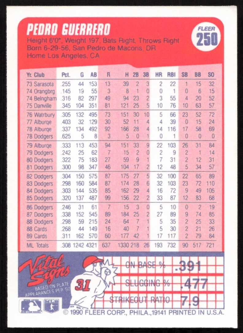 This Baseball card, from 1990 is part of the Fleer card set. Pedro Guerrero is featured and has a card number of 250.