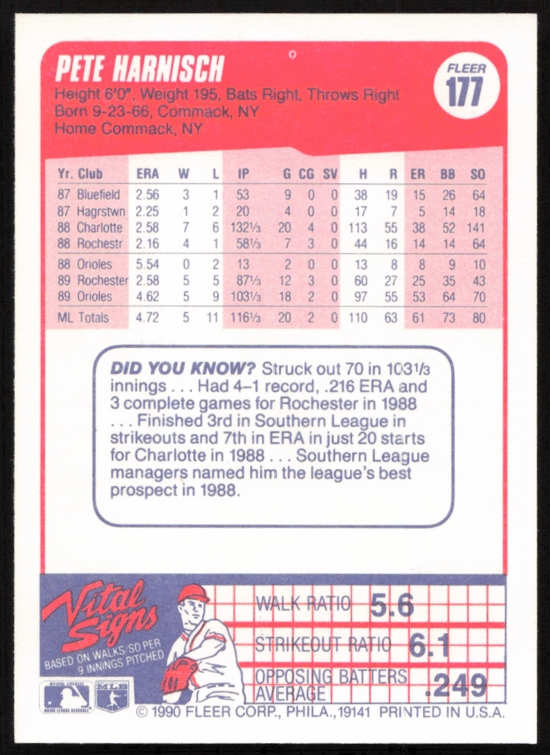 This Baseball card, from 1990 is part of the Fleer card set. Pete Harnisch is featured and has a card number of 177.