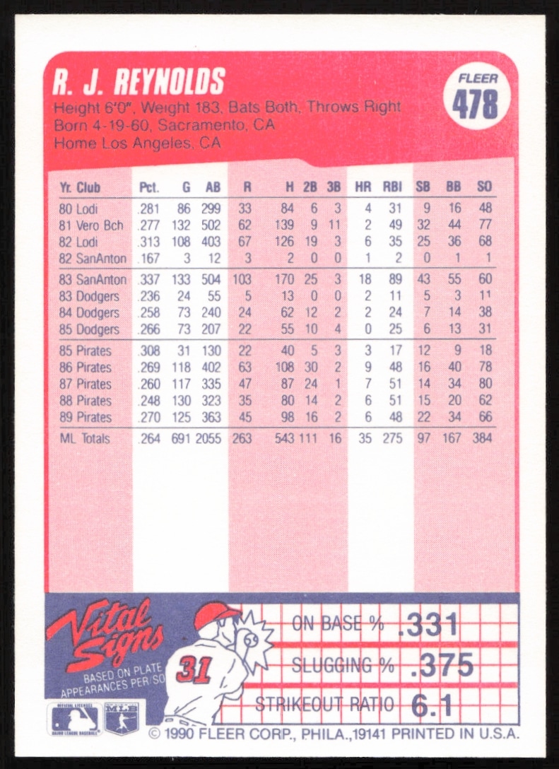 This Baseball card, from 1990 is part of the Fleer card set. R.J. Reynolds is featured and has a card number of 478.