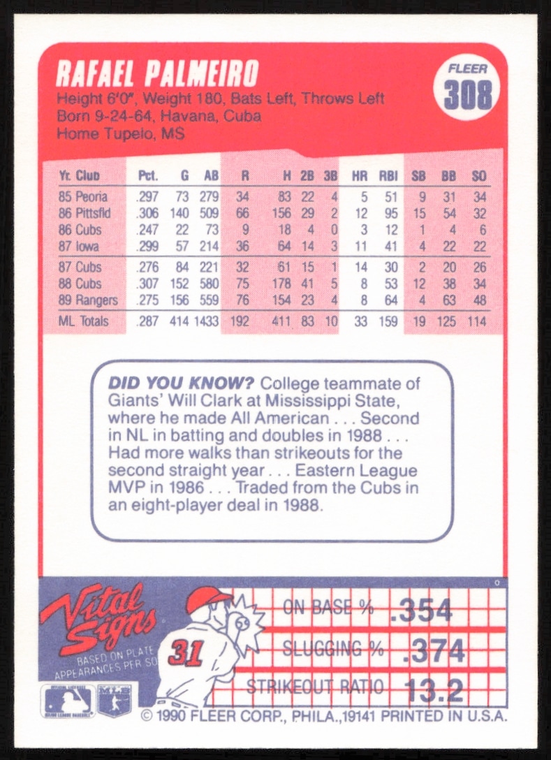 This Baseball card, from 1990 is part of the Fleer card set. Rafael Palmeiro is featured and has a card number of 308.