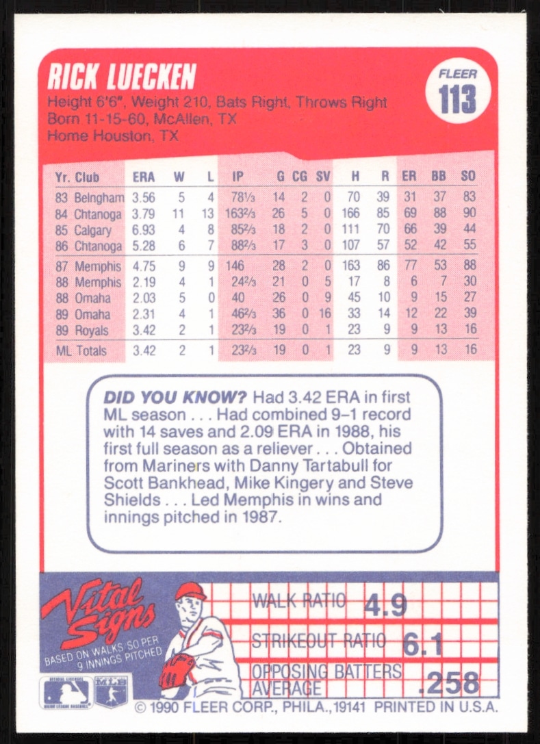This Baseball card, from 1990 is part of the Fleer card set. Rick Luecken is featured and has a card number of 113.