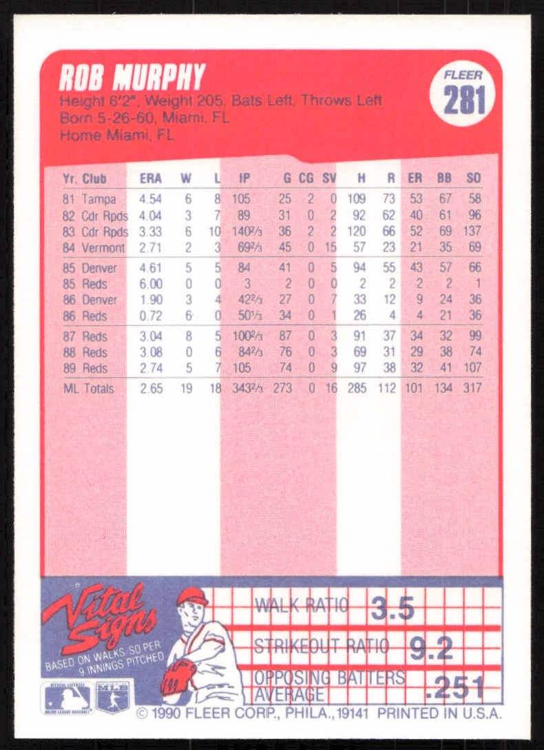 This Baseball card, from 1990 is part of the Fleer card set. Rob Murphy is featured and has a card number of 281.
