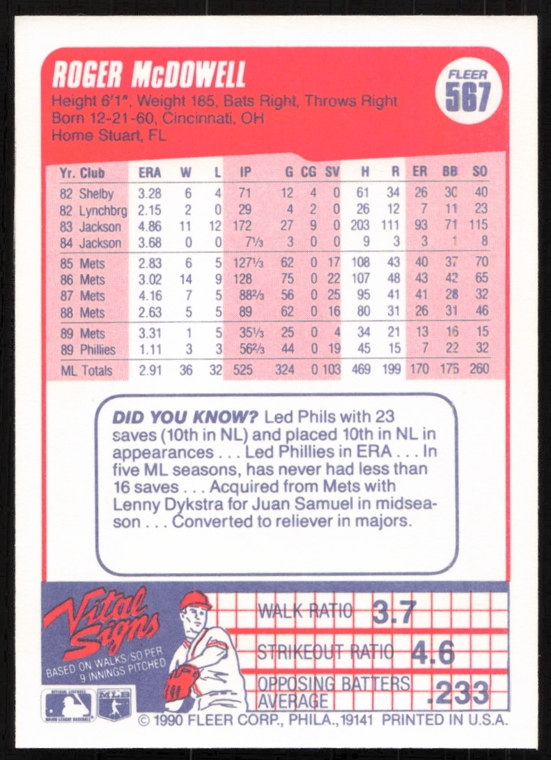 This Baseball card, from 1990 is part of the Fleer card set. Roger McDowell is featured and has a card number of 567.