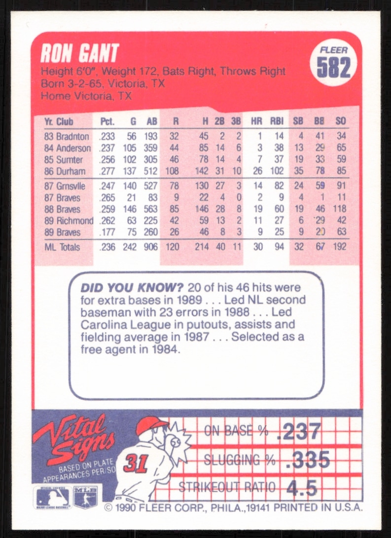 This Baseball card, from 1990 is part of the Fleer card set. Ron Gant is featured and has a card number of 582.