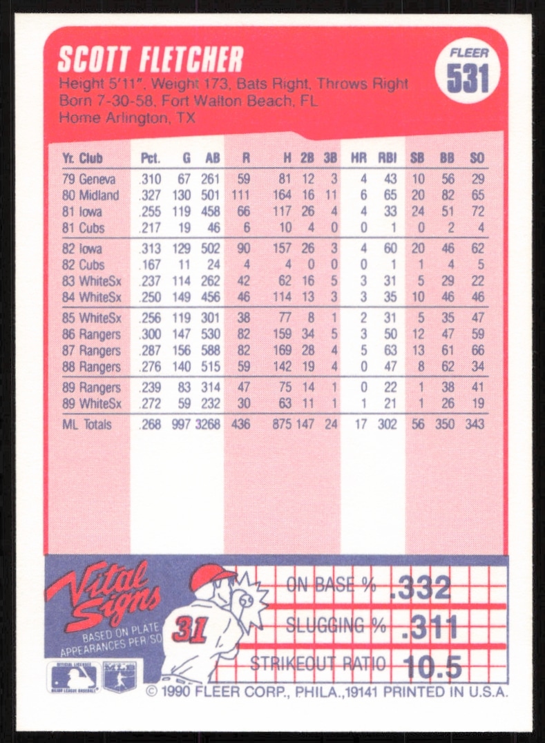 This Baseball card, from 1990 is part of the Fleer card set. Scott Fletcher is featured and has a card number of 531.