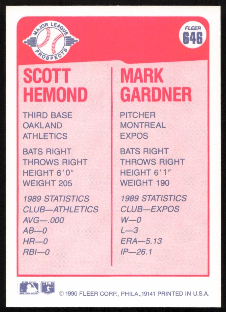 This Baseball card, from 1990 is part of the Fleer card set. Scott Hemond / Mark Gardner is featured and has a card number of 646.