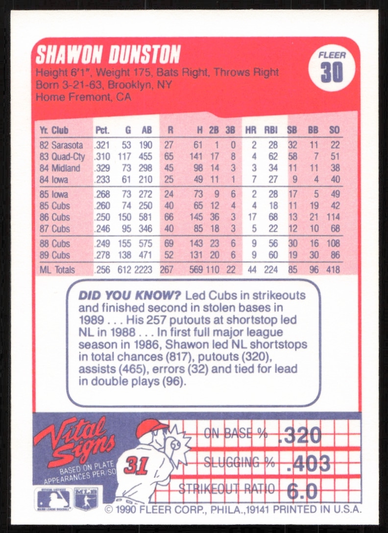 This Baseball card, from 1990 is part of the Fleer card set. Shawon Dunston is featured and has a card number of 30.