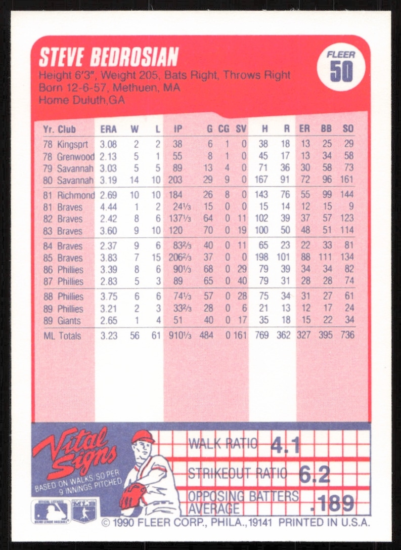 This Baseball card, from 1990 is part of the Fleer card set. Steve Bedrosian is featured and has a card number of 50.