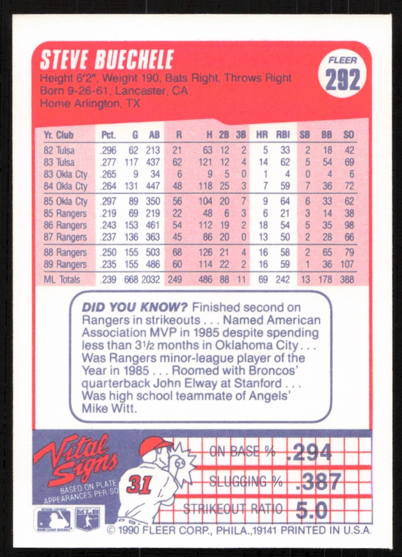 This Baseball card, from 1990 is part of the Fleer card set. Steve Buechele is featured and has a card number of 292.