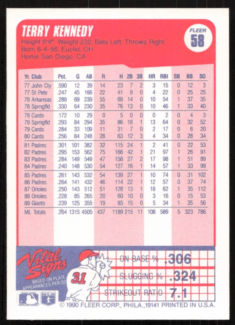 This Baseball card, from 1990 is part of the Fleer card set. Terry Kennedy is featured and has a card number of 58.