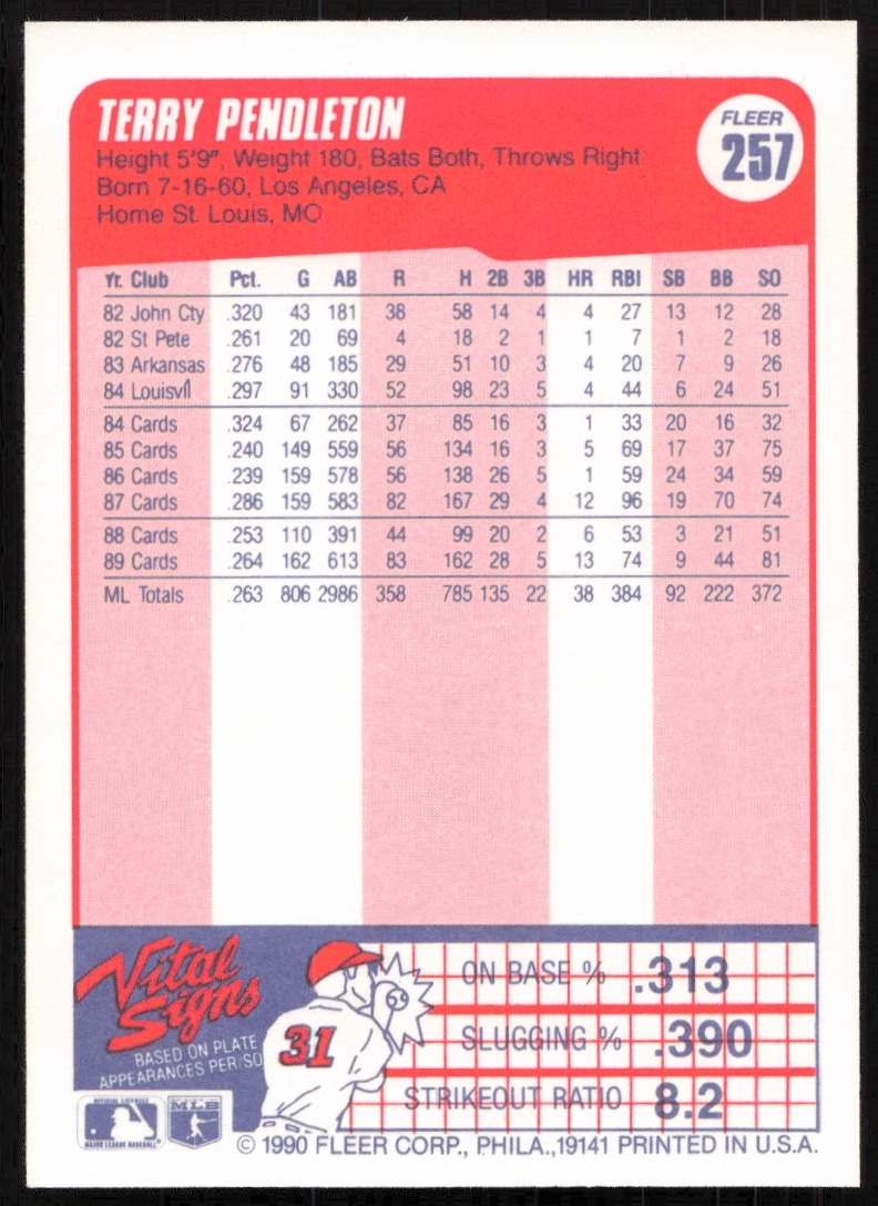 This Baseball card, from 1990 is part of the Fleer card set. Terry Pendleton is featured and has a card number of 257.