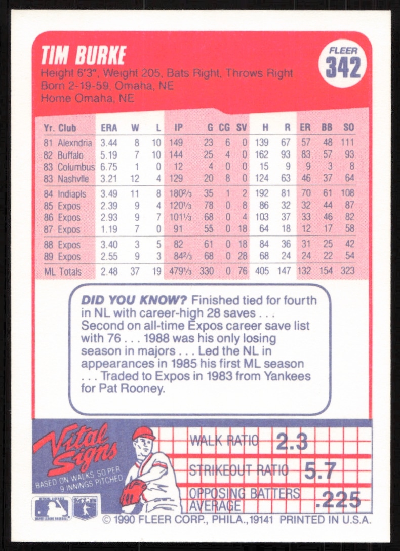 This Baseball card, from 1990 is part of the Fleer card set. Tim Burke is featured and has a card number of 342.
