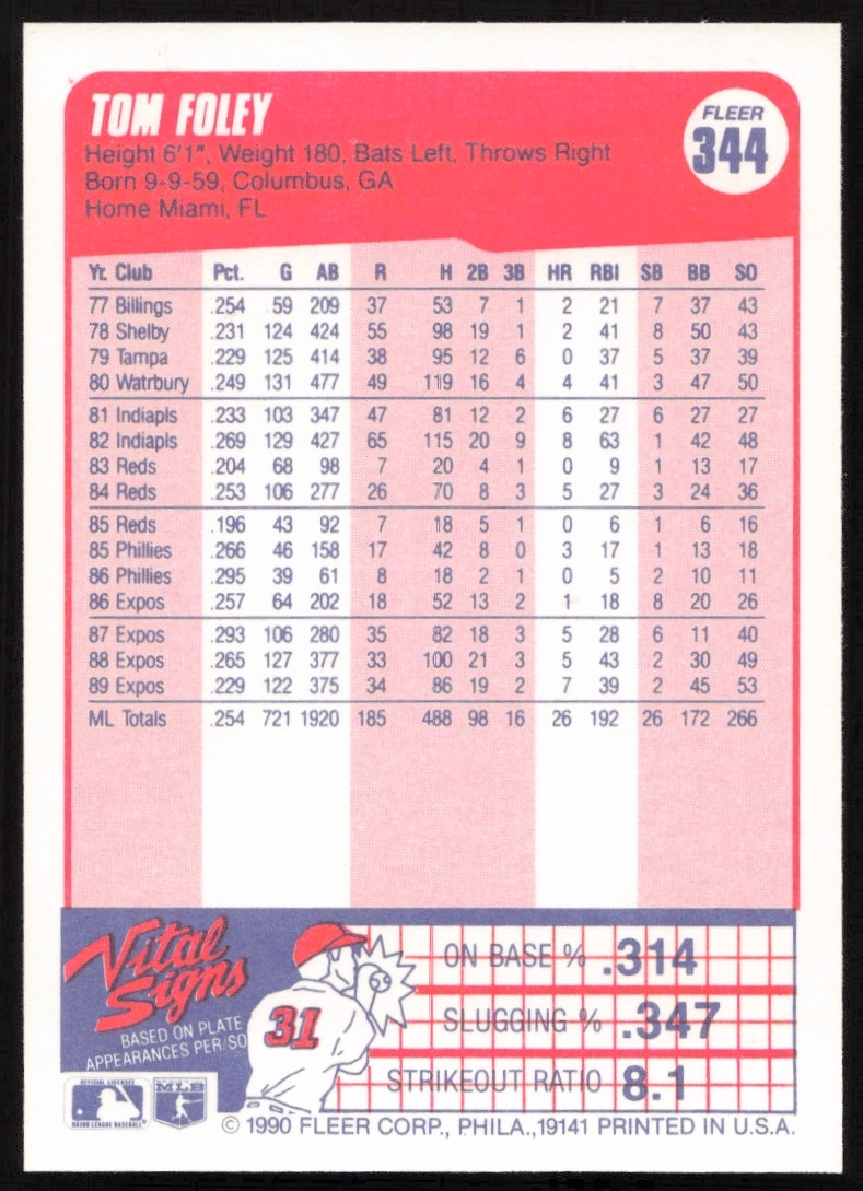 This Baseball card, from 1990 is part of the Fleer card set. Tom Foley is featured and has a card number of 344.