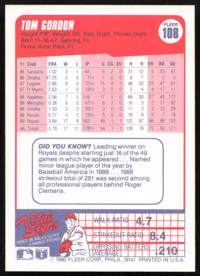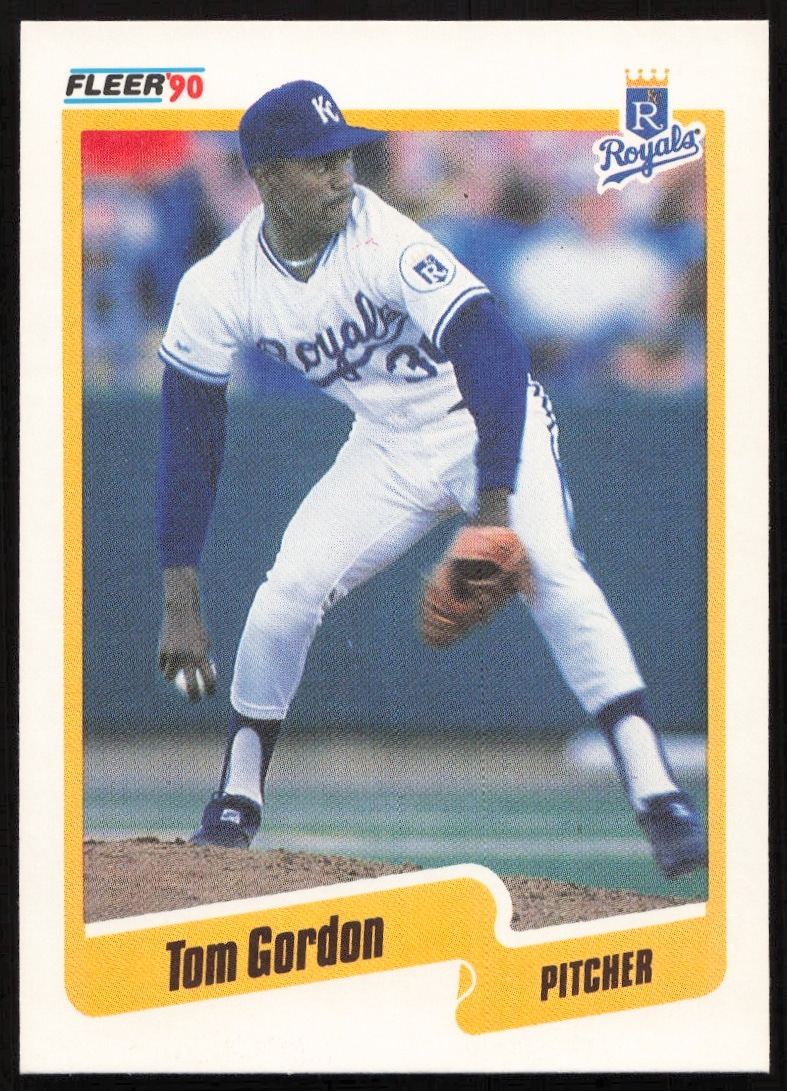 This Baseball card, from 1990 is part of the Fleer card set. Tom Gordon is featured and has a card number of 108.