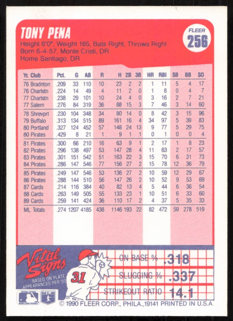 This Baseball card, from 1990 is part of the Fleer card set. Tony Pena is featured and has a card number of 256.
