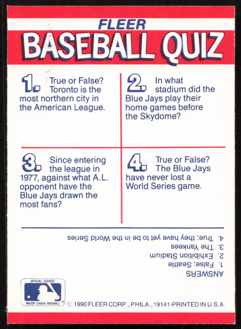 This Baseball card, from 1990 is part of the Fleer card set. Toronto Blue Jays is featured and has a card number of .