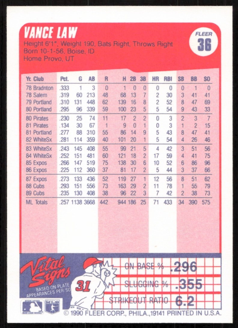 This Baseball card, from 1990 is part of the Fleer card set. Vance Law is featured and has a card number of 36.