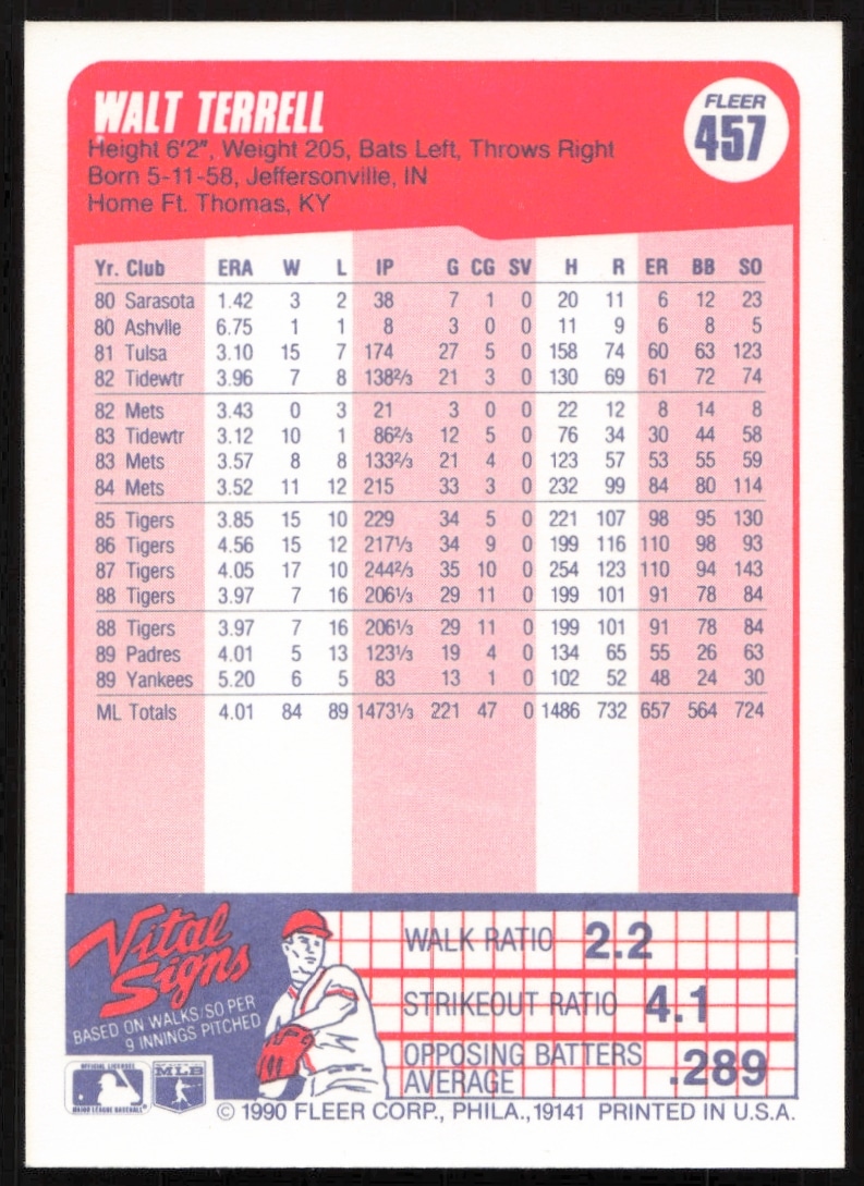This Baseball card, from 1990 is part of the Fleer card set. Walt Terrell is featured and has a card number of 457.