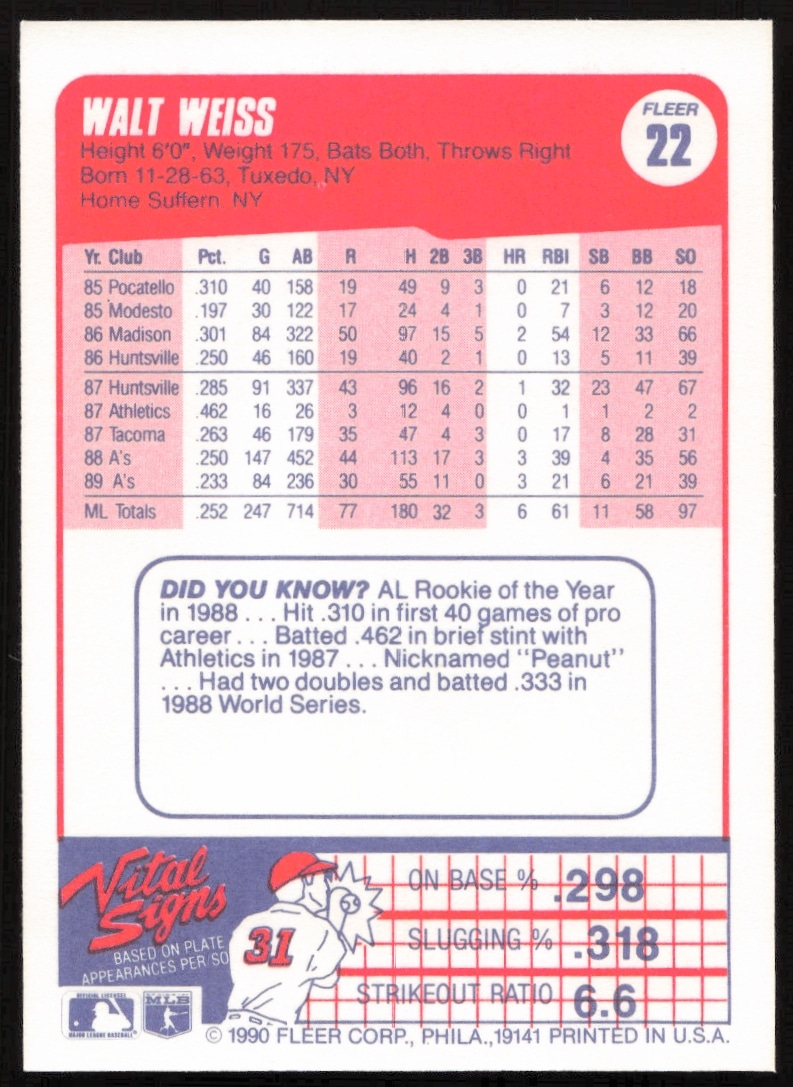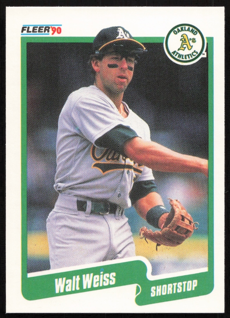 This Baseball card, from 1990 is part of the Fleer card set. Walt Weiss is featured and has a card number of 22.