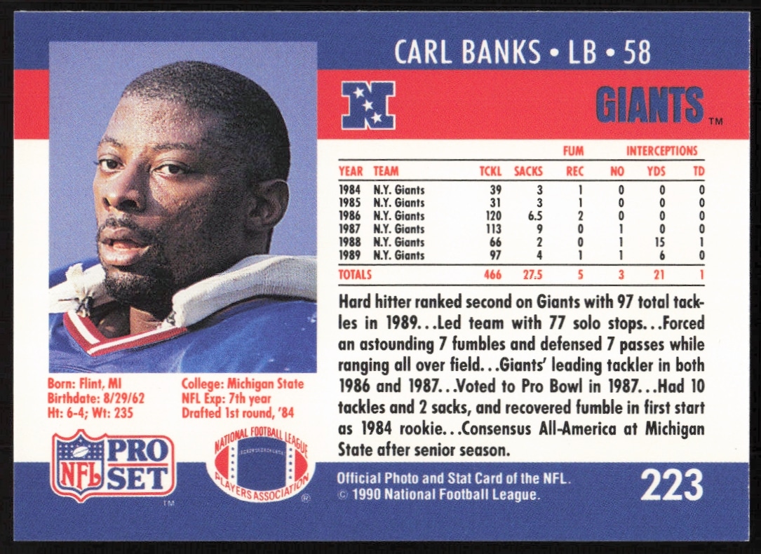 This Football card, from 1990 is part of the Pro Set card set. Carl Banks is featured and has a card number of 223.