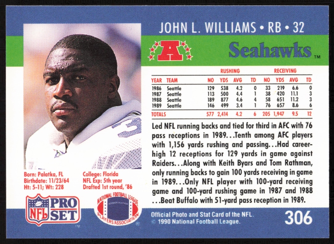 This Football card, from 1990 is part of the Pro Set card set. John L. Williams is featured and has a card number of 306.