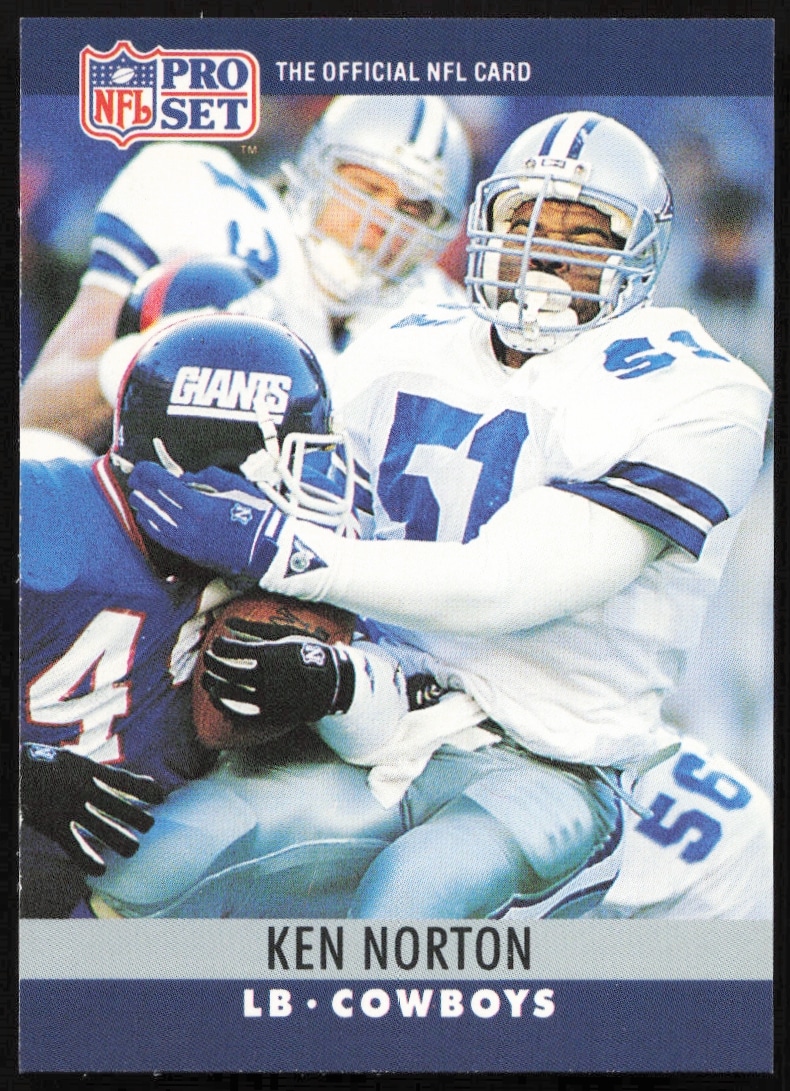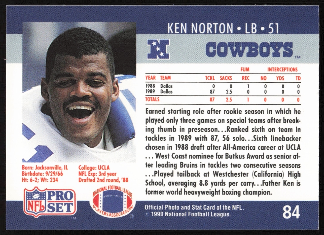 This Football card, from 1990 is part of the Pro Set card set. Ken Norton is featured and has a card number of 84.