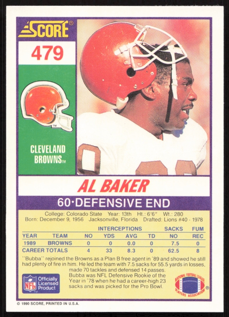 This Football card, from 1990 is part of the Score card set. Al Baker is featured and has a card number of 479.