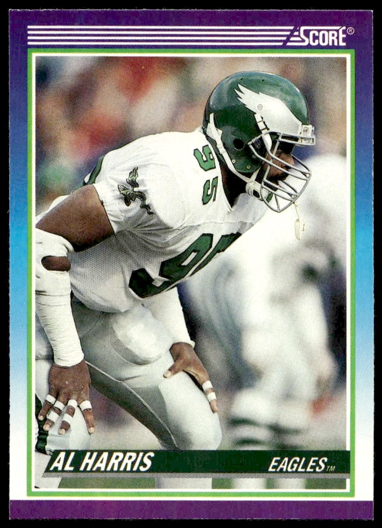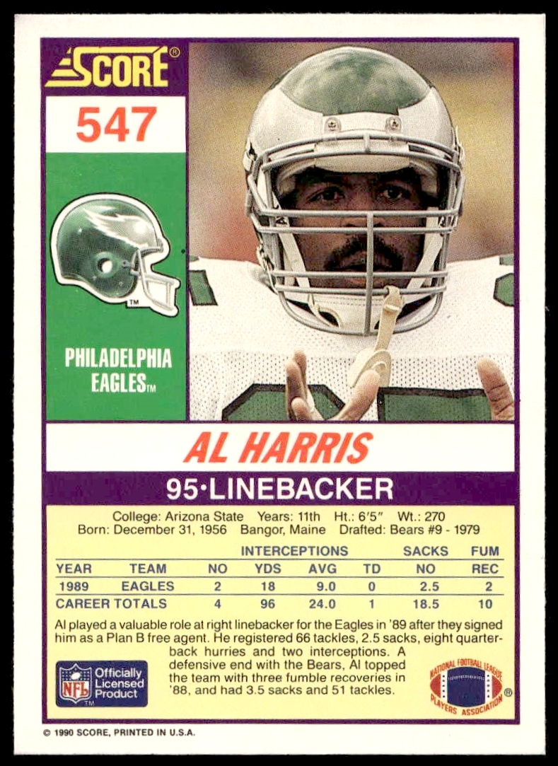 This Football card, from 1990 is part of the Score card set. Al Harris is featured and has a card number of 547.