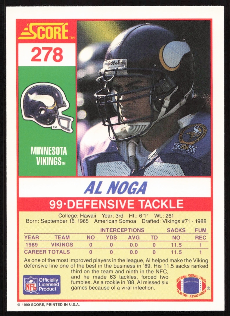 This Football card, from 1990 is part of the Score card set. Al Noga is featured and has a card number of 278.