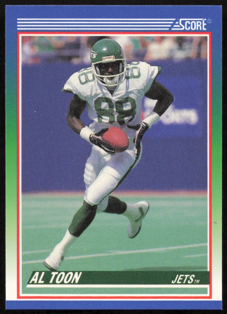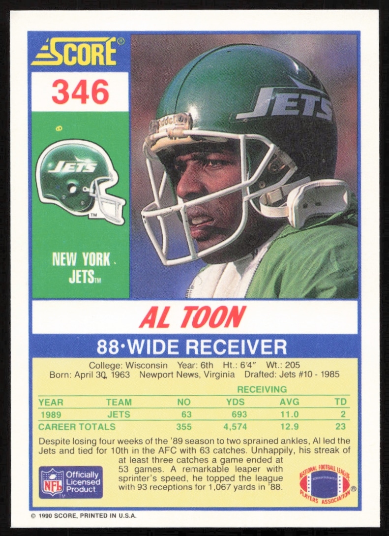 This Football card, from 1990 is part of the Score card set. Al Toon is featured and has a card number of 346.