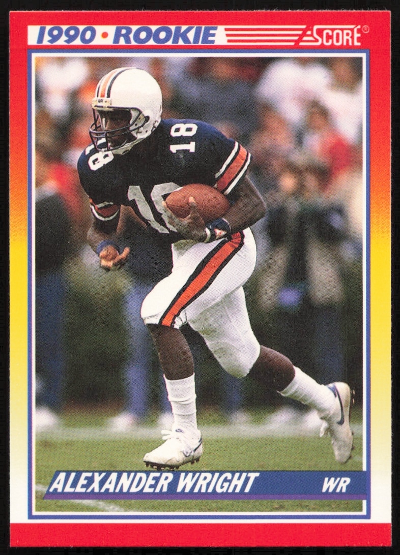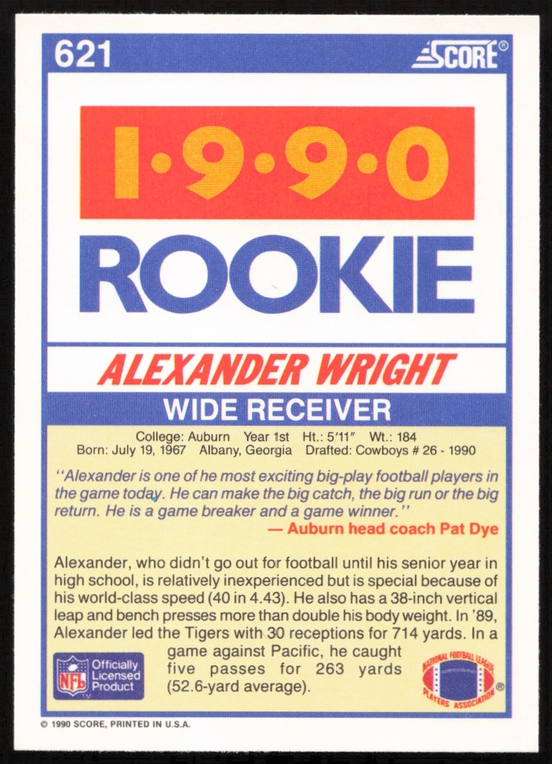 This Football card, from 1990 is part of the Score card set. Alexander Wright is featured and has a card number of 621.