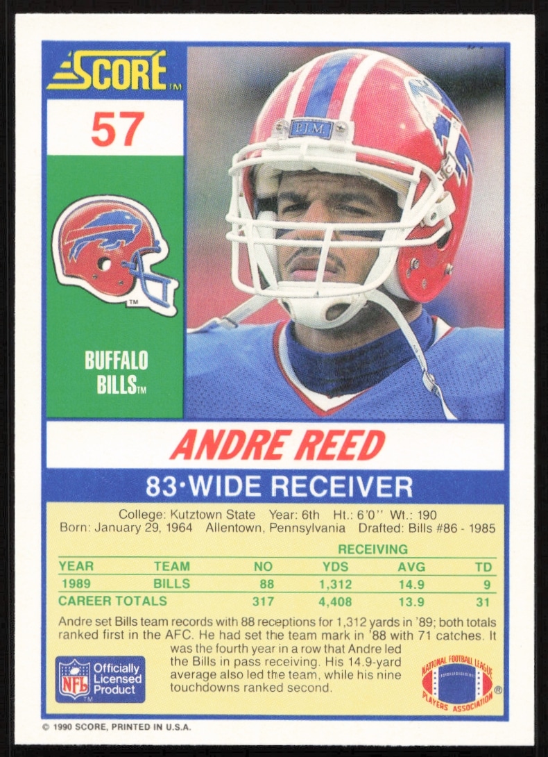 This Football card, from 1990 is part of the Score card set. Andre Reed is featured and has a card number of 57.