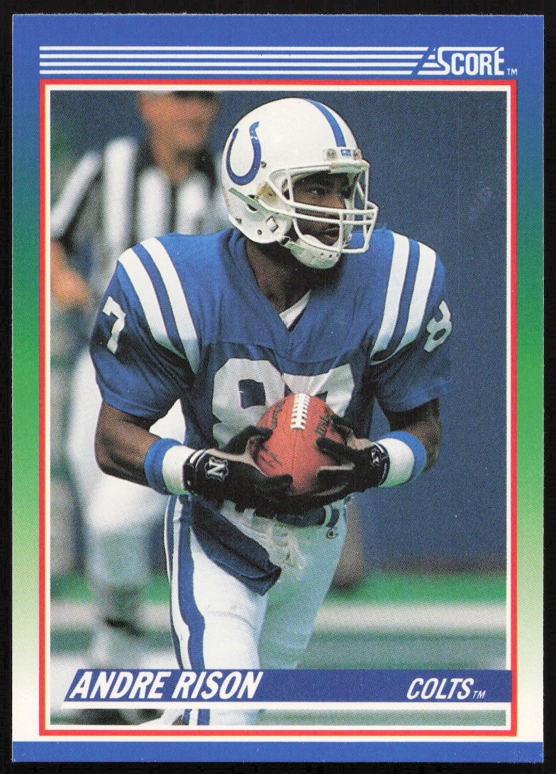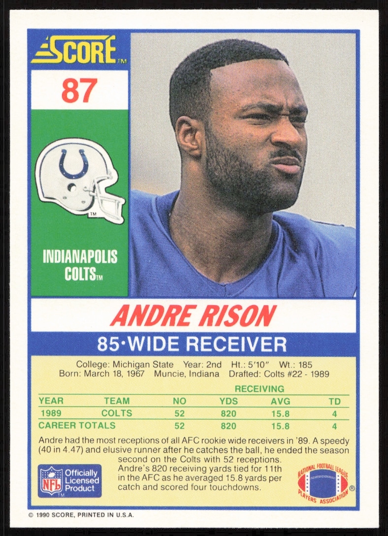 This Football card, from 1990 is part of the Score card set. Andre Rison is featured and has a card number of 87.