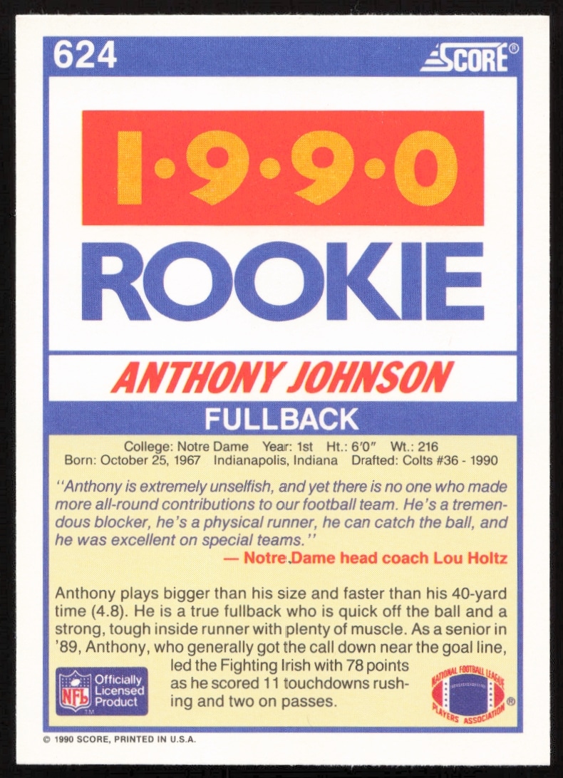 This Football card, from 1990 is part of the Score card set. Anthony Johnson is featured and has a card number of 624.