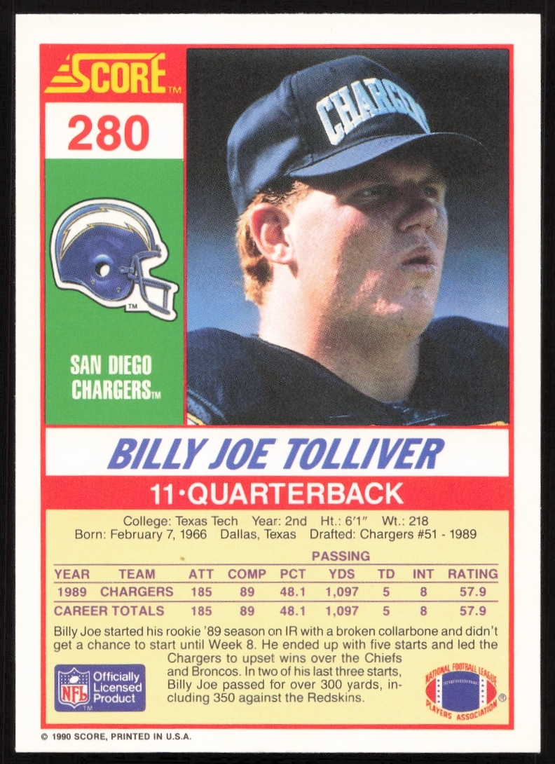 This Football card, from 1990 is part of the Score card set. Billy Joe Tolliver is featured and has a card number of 280.