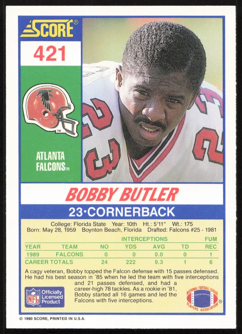This Football card, from 1990 is part of the Score card set. Bobby Butler is featured and has a card number of 421.