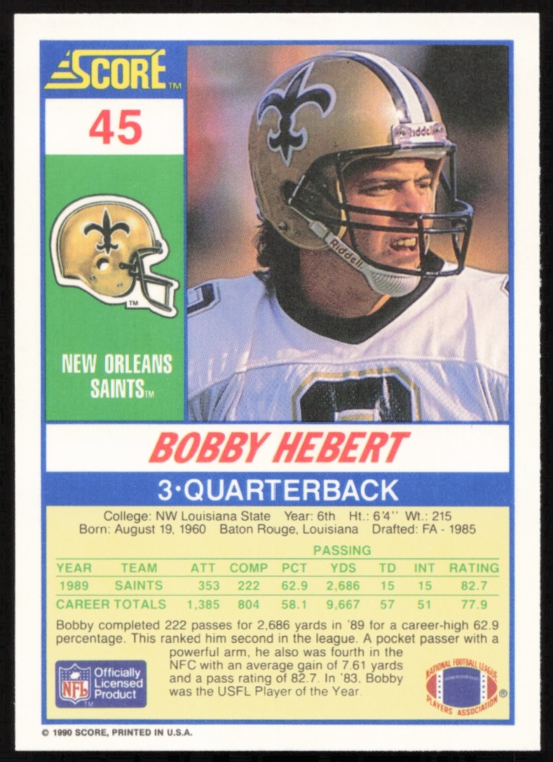 This Football card, from 1990 is part of the Score card set. Bobby Hebert is featured and has a card number of 45.