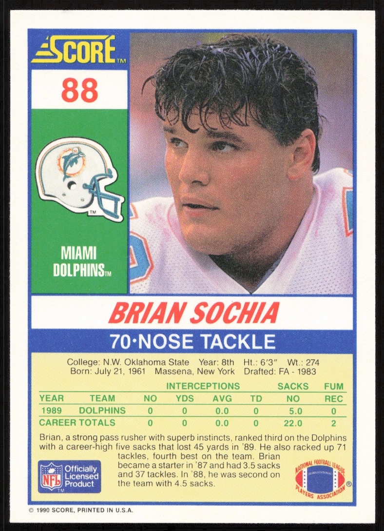 This Football card, from 1990 is part of the Score card set. Brian Sochia is featured and has a card number of 88.