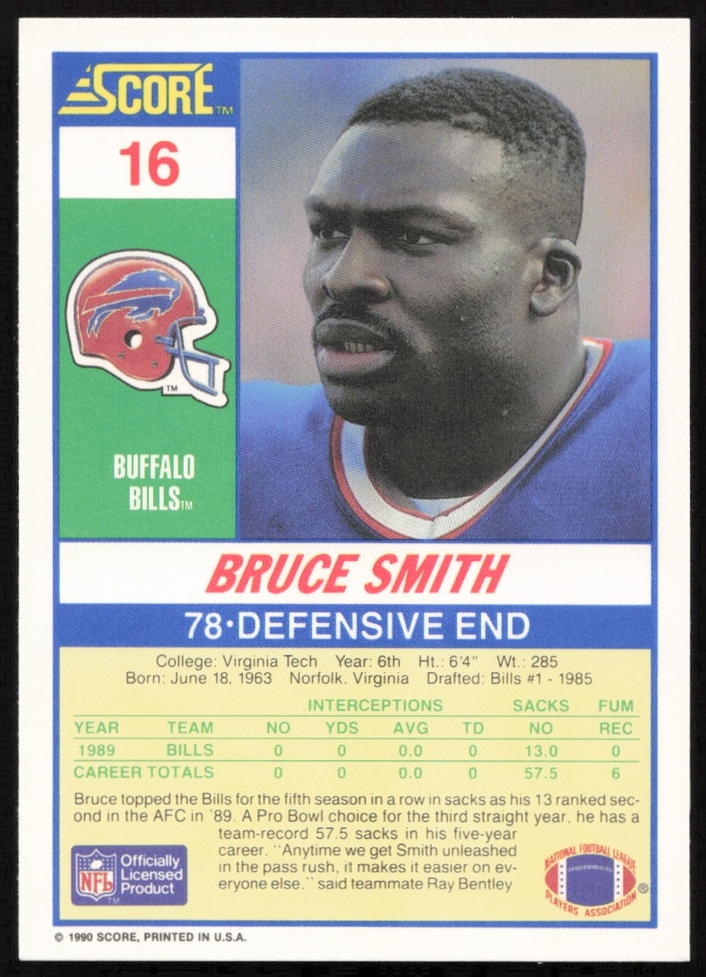 This Football card, from 1990 is part of the Score card set. Bruce Smith is featured and has a card number of 16.