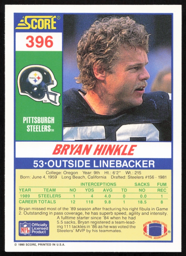 This Football card, from 1990 is part of the Score card set. Bryan Hinkle is featured and has a card number of 396.