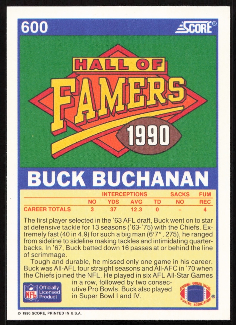 1990 Score Buck Buchanan (Error on Back – Draft Year Incorrect) #600