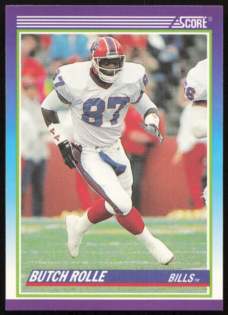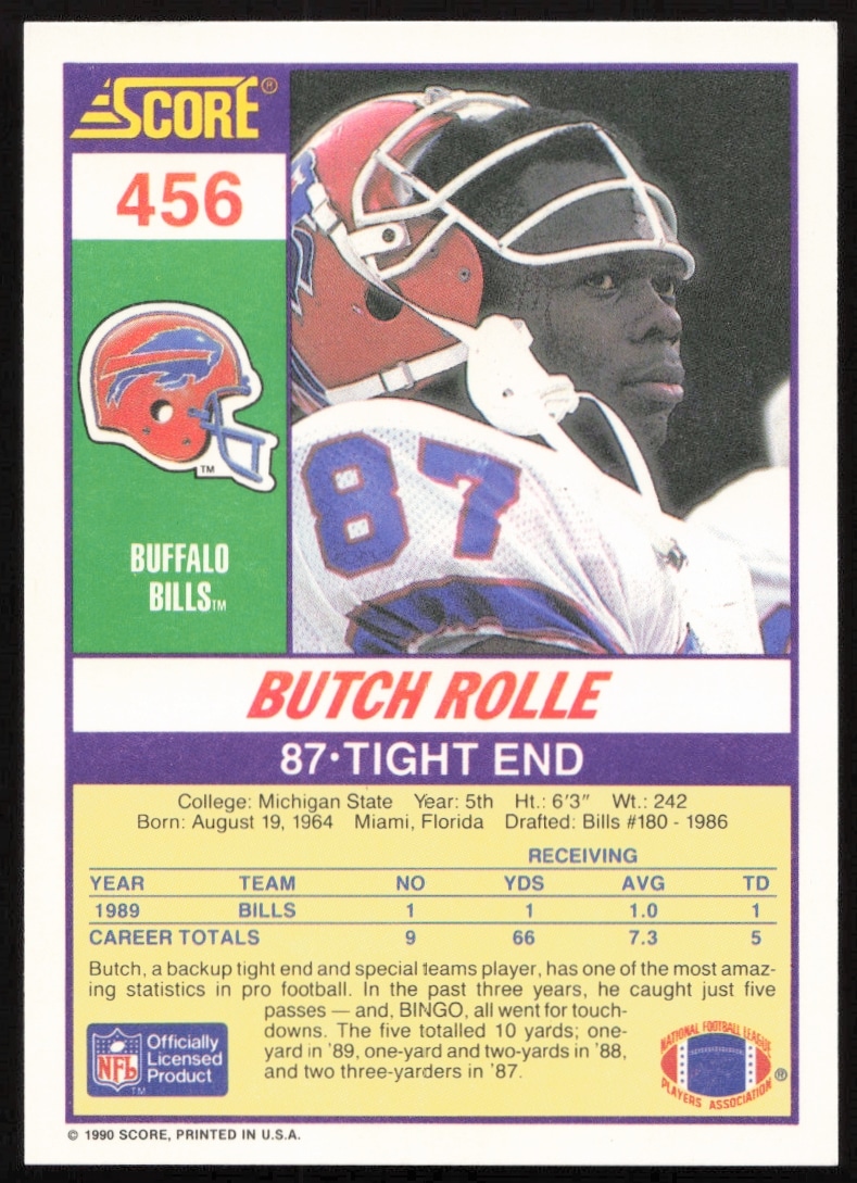 This Football card, from 1990 is part of the Score card set. Butch Rolle is featured and has a card number of 456.