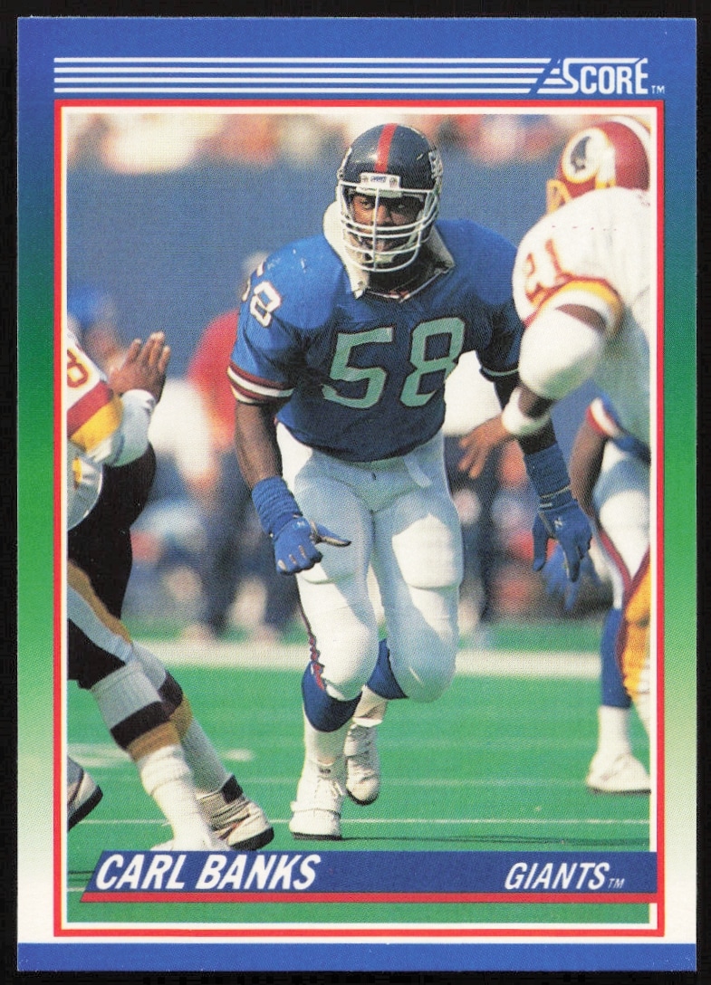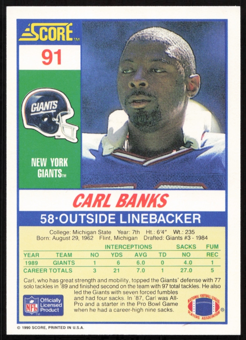 This Football card, from 1990 is part of the Score card set. Carl Banks is featured and has a card number of 91.