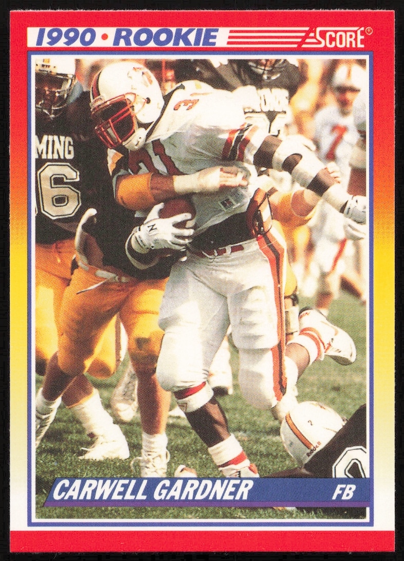 This Football card, from 1990 is part of the Score card set. Carwell Gardner is featured and has a card number of 635.
