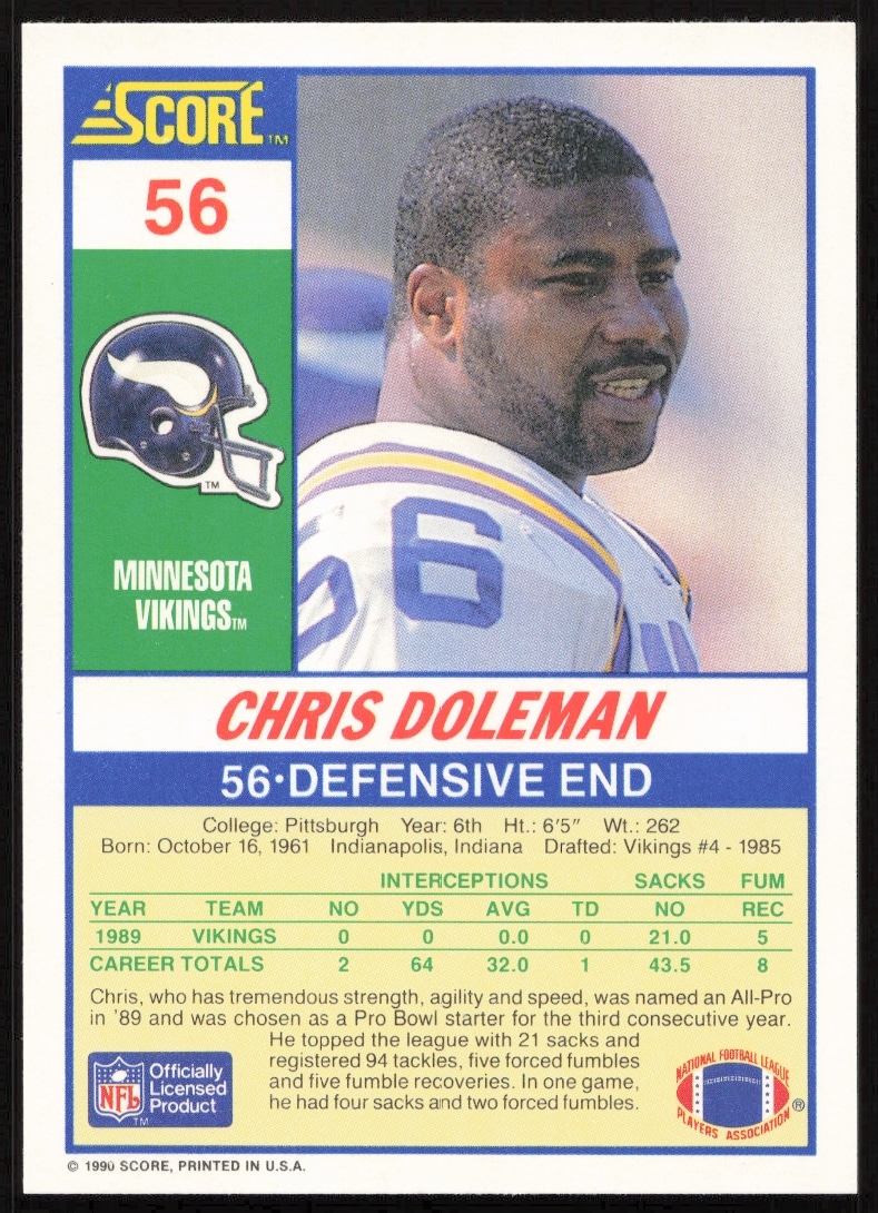 This Football card, from 1990 is part of the Score card set. Chris Doleman is featured and has a card number of 56.