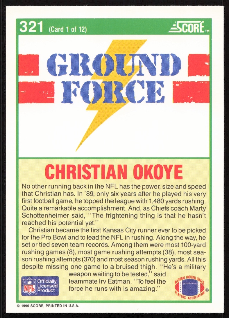 This Football card, from 1990 is part of the Score card set. Christian Okoye is featured and has a card number of 321.