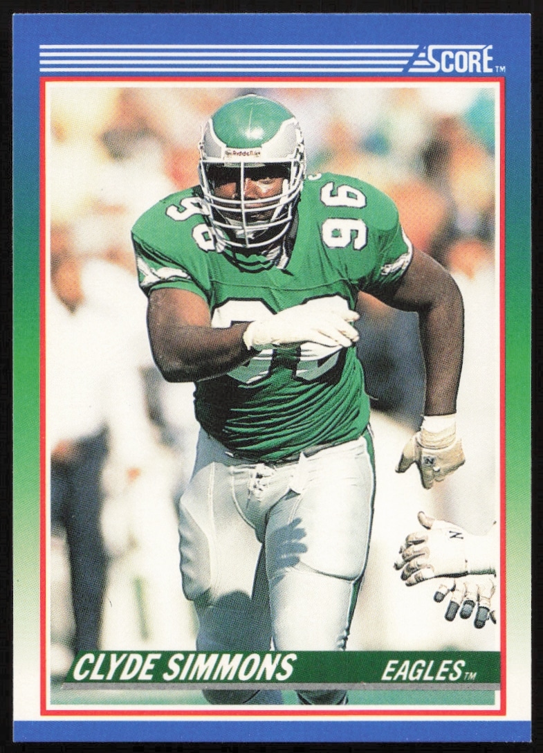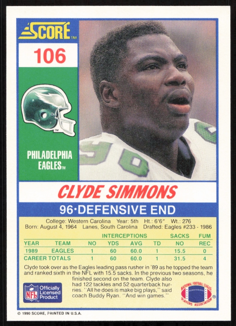 This Football card, from 1990 is part of the Score card set. Clyde Simmons is featured and has a card number of 106.