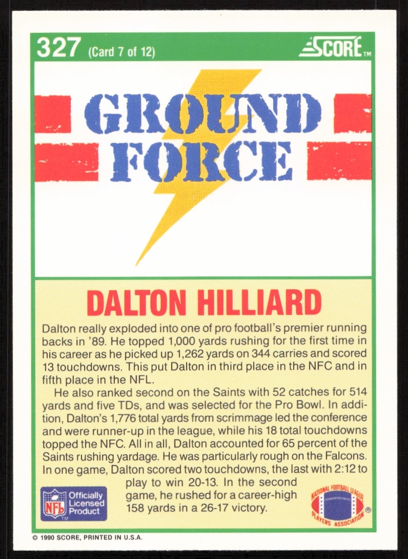 This Football card, from 1990 is part of the Score card set. Dalton Hilliard is featured and has a card number of 327.