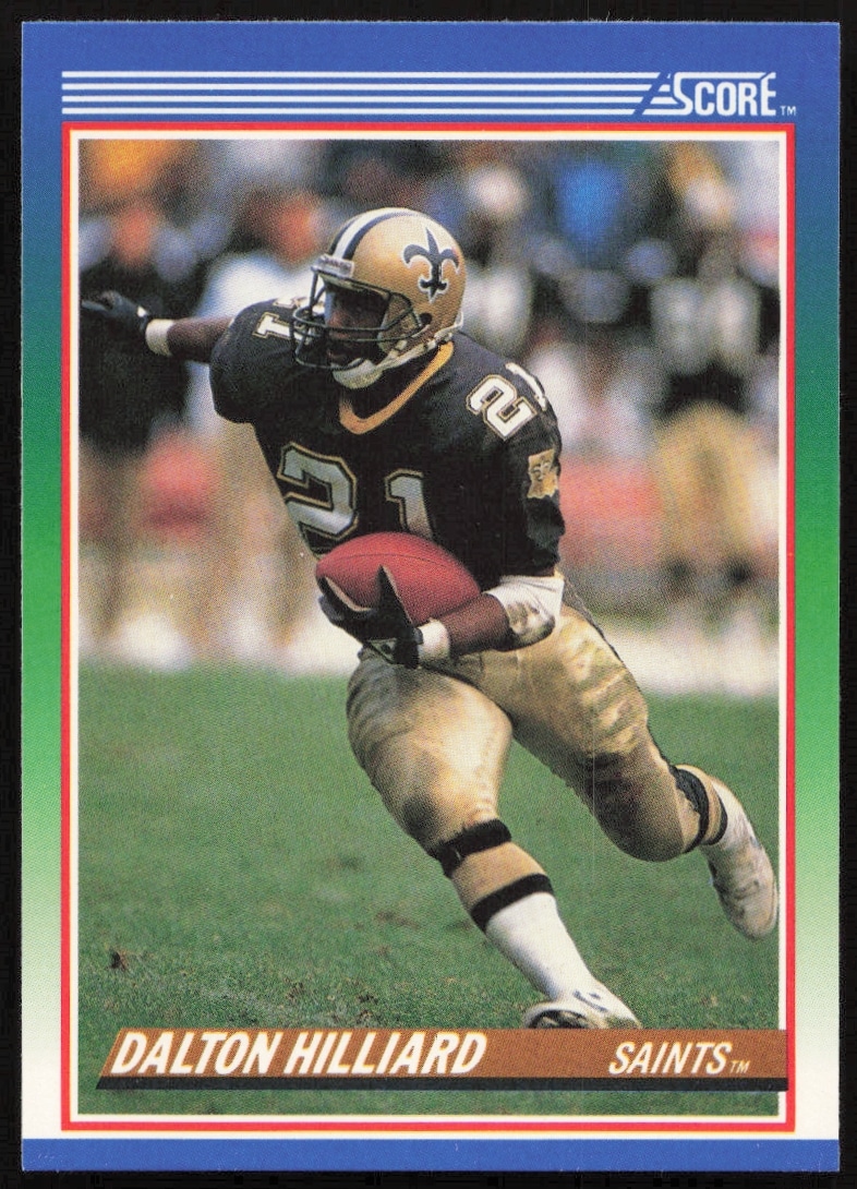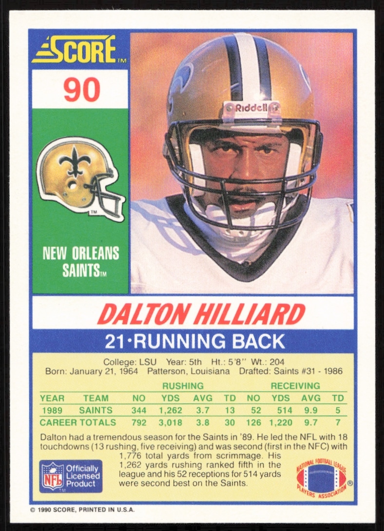 This Football card, from 1990 is part of the Score card set. Dalton Hilliard is featured and has a card number of 90.