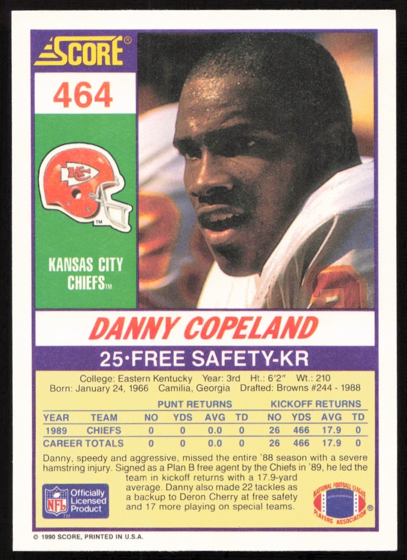 This Football card, from 1990 is part of the Score card set. Danny Copeland is featured and has a card number of 464.